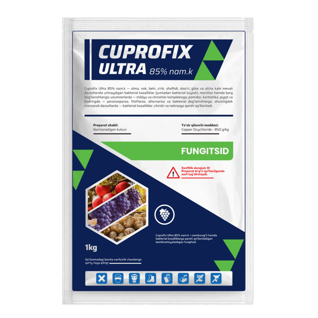 Cuprofix Ultra 85% nam.k – olma, nok, behi, o’rik, shaftoli, olxo’ri, gilos va olcha kabi mevali daraxtlarida uchraydigan bakterial kasalliklar (jumladan bakterial kuyish), monilioz hamda barg dog’lanishlariga, uzumzorlarda – mildyu va chirishlar kompleksiga pomidor, kartoshka, piyoz va bodringda – perenosporoz, fitoftaroz, alternarioz va bakterial dog’lanishlarga, shuningdek manzarali daraxtlarda – bakterial kasalliklar, chirish va nekrozga qarshi qo’llaniladi.