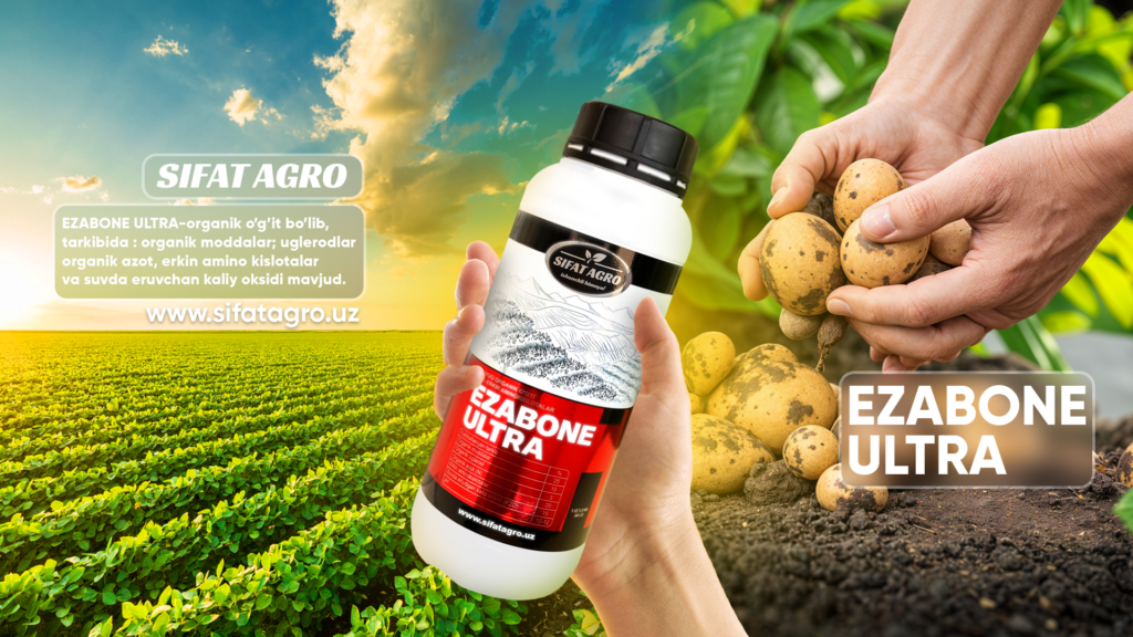 EZABONE ULTRA-organik o’g’it bo’lib, tarkibida : organik moddalar; uglerodlar organik azot, erkin amino kislotalar va suvda eruvchan kaliy oksidi mavjud. Tarkibi tufayli o’simliklarning abiotik omillar tufayli yuzaga keladigan, stress sharoitiga chidamliligini oshiradi hamda dori vositalaridan noto’g’ri foydalanish oqibatida kelib chiqadigan salbiy holatlarni bartaraf etishda qo’llaniladi.