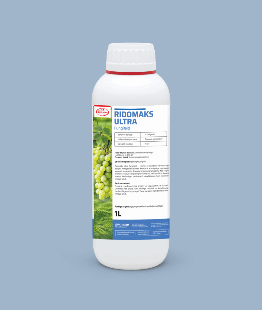 Ridomaks Ultra fungitsidi – tizimli va kompleks ta’siriga ega bo’lgan, himoyalovchi hamda davolovchi xususiyatga ega yuqori samarali preparatdir. Preparat o’simlik to’qimalariga tez singib ekinlarni nafaqat ochiq (aniq ko’rinadigan) balki yashirin (latent) shaklda kechadigan zamburug’li kasalliklardan ham ishonchli himoya qiladi.