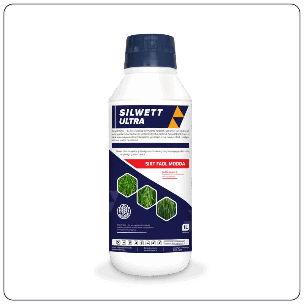Tavsif: Silwett Ultra — bu suv asosidagi eritmalarda tarqalish, yopishish va kirib borish xususiyatlarini kuchaytiruvchi yordamchi bo’lib, u gerbitsid (Grass Ultra 10 % em.k) tank aralashmalarda tomchi tarqalishini yaxshilash uchun maxsus ishlab chiqilgan sirt faol modda hisoblanadi.